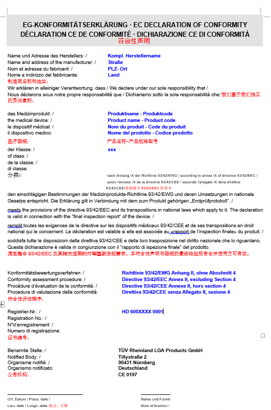 符合性聲明應使用主管當局接受的語言編寫,通常至少包括英語。一份DOC對應一種產品。例如下圖這份按照MDD需公告機構簽發CE證書的醫療器械DOC,包括了德語,英語,馬耳他語,意大利語四種歐盟官方語言(中文僅為方便理解)。