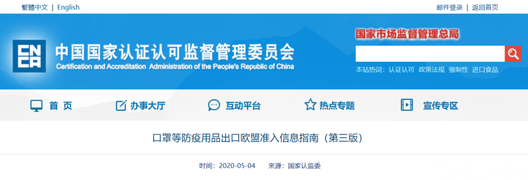 昨日,國家認監委發布第三版口罩等防疫用品出口歐盟準入信息指南,全文如下: