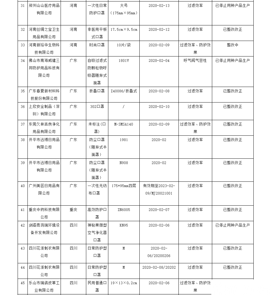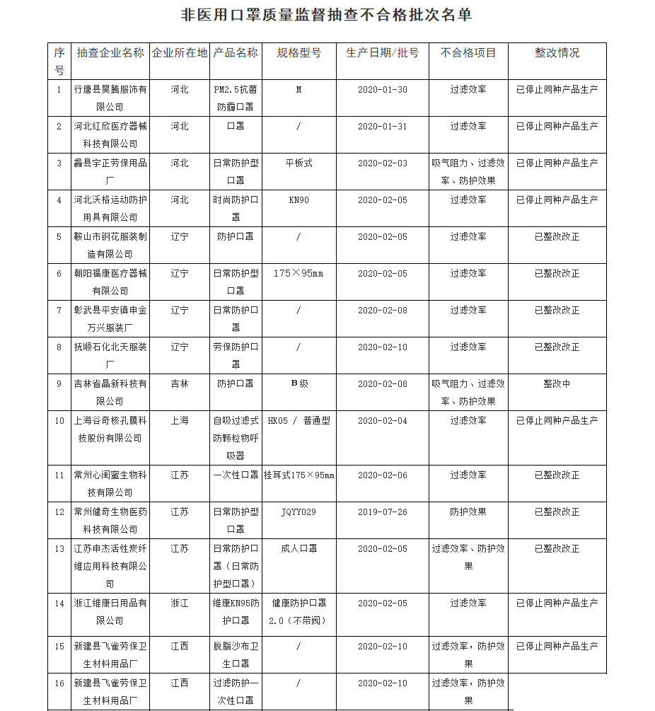 今年2月以來,市場監管總局組織開展了非醫用口罩產品質量監督專項抽查,共檢出47家企業的51批次不合格產品,現將非醫用口罩質量監督抽查不合格批次名單公布如下。