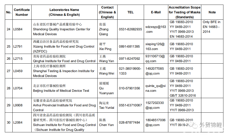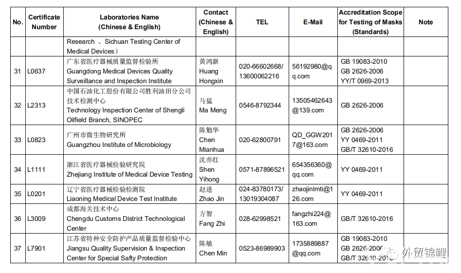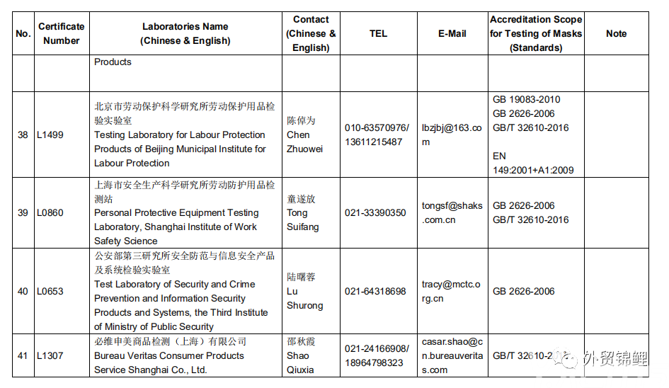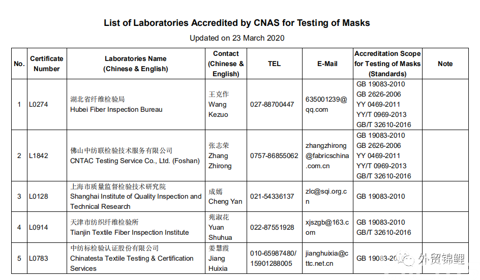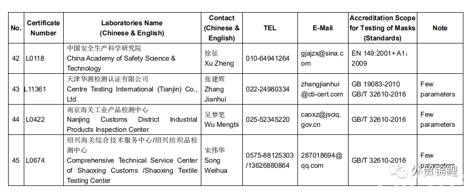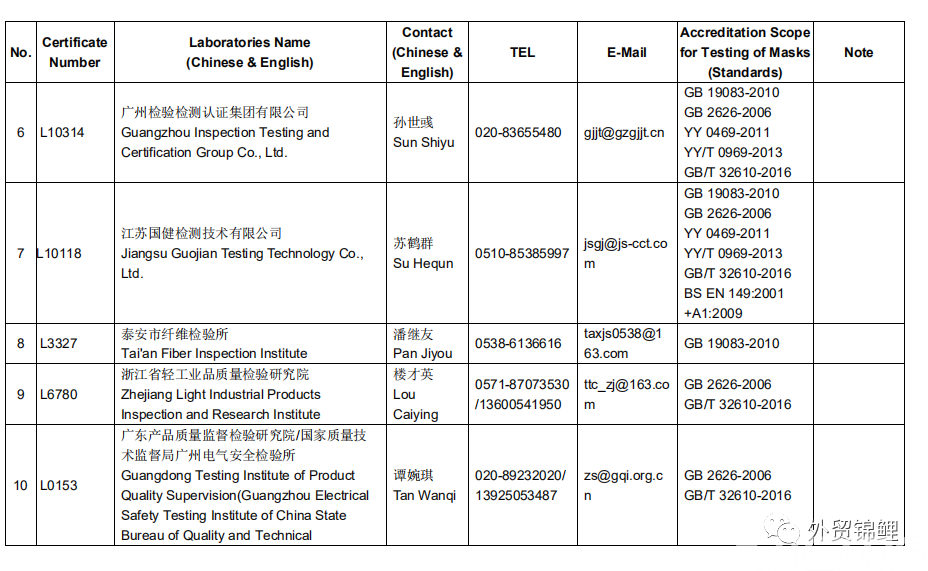 要點(diǎn):檢測報告必須是CNAS 指定的46家檢測機(jī)構(gòu)認(rèn)證的才有效,其他任何機(jī)構(gòu)認(rèn)證的都作無效處理,航司/船期會拒絕裝載貨物。如果有近期出口罩的伙伴務(wù)必要核實自己的檢測報告是否有效,以下為官方認(rèn)可的檢測機(jī)構(gòu),如需完整表單找本鯉索取。