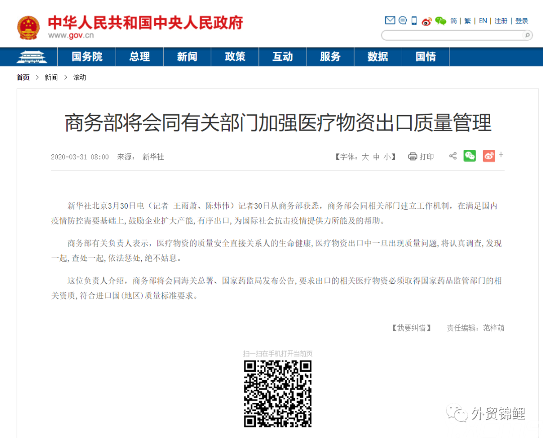 鑒于以上種種情況,商貿(mào)部為了規(guī)范醫(yī)療產(chǎn)品行業(yè),尤以口罩產(chǎn)品為主,已經(jīng)宣布對當(dāng)前醫(yī)療物資出口增加必要的超常規(guī)管理,督促企業(yè)以更加負(fù)責(zé)任的態(tài)度接單生產(chǎn)并出口,力爭把不合格的醫(yī)療物資產(chǎn)品擋在國門之內(nèi)。