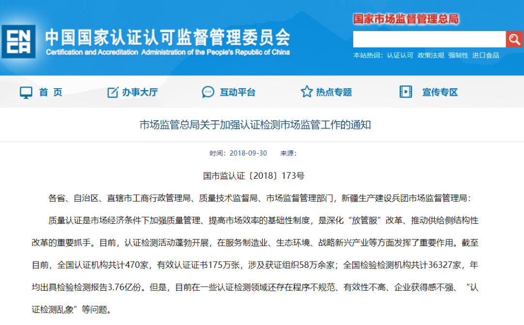 2018年9月30日,中國國家認證認可監督管理委員會發布了《關于加強認證監測市場監管認證的工作通知》,認證行業內開始了整頓不正規機構的行動,發現了很多的“問題”機構存在“認證檢測亂象”的問題 。